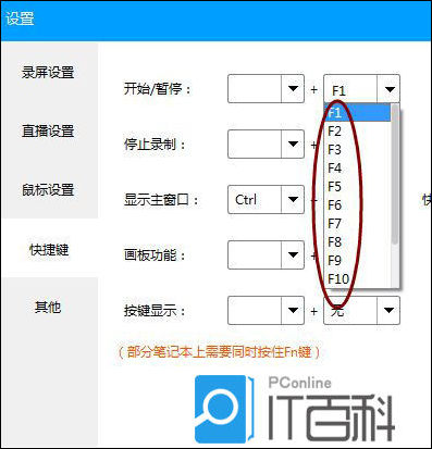 当然,昨天的选项中也可以不选择,只选择右边的 F1到F10 中的一个。这样更加便捷。只按F1到F10中的任何一个键就 开始录制和暂停 。