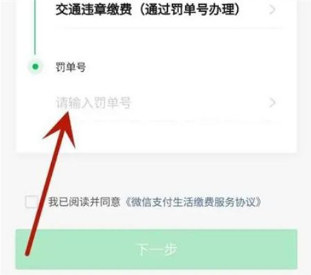 3.接下来在进入的缴费界面里选择缴费项目为“交通违章缴费”,在下面罚单号的输入框里输入罚单号,点击缴费服务协议前面的小方块进行勾选后,在页面下方点击“下一步”按钮即可。