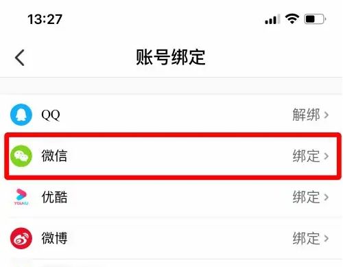 4、在列表中找到【微信】,点击右侧的【绑定】。
