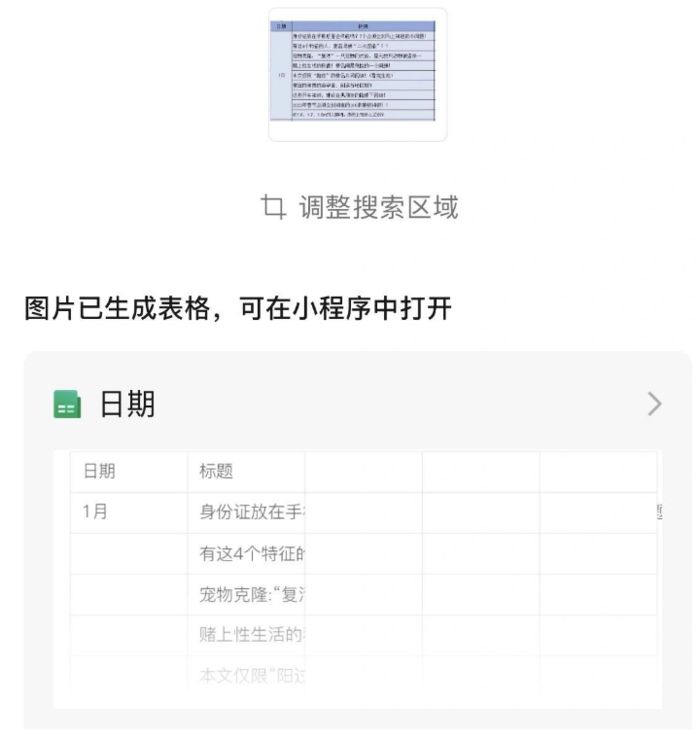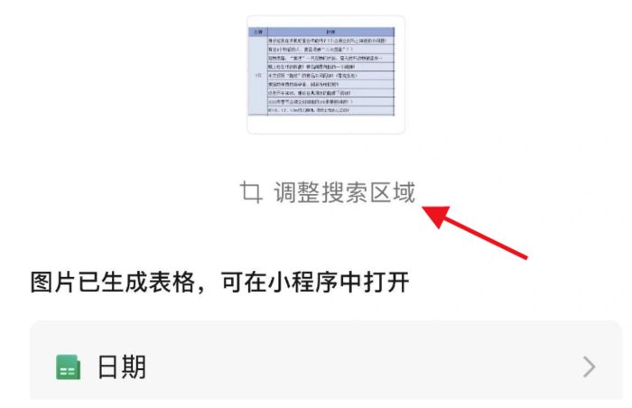 4、可以调整转换为电子表格的区域,也可以在小程序中找到该电子表格。