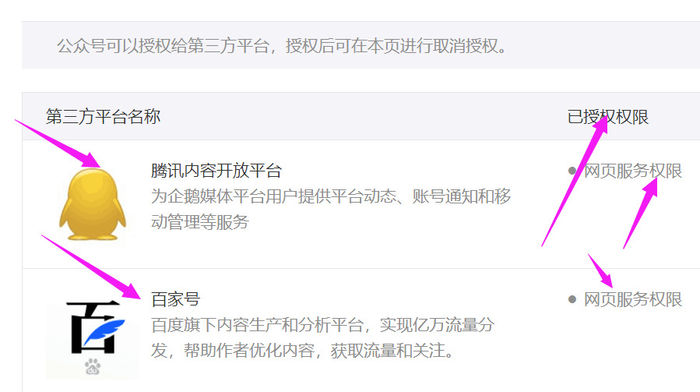 4、然后就可以看到你所授权的自媒体平台,上面清楚的写着授权的平台,和授权的权限。这就意味着你在公众号上发的文章,都会自动更新到这些平台上去。