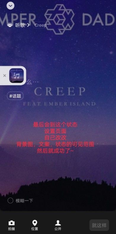 5、然后会自动跳到状态页面,改改文案、背景图、状态权限啥的。(此时那首歌曲已经被成功分享了);
