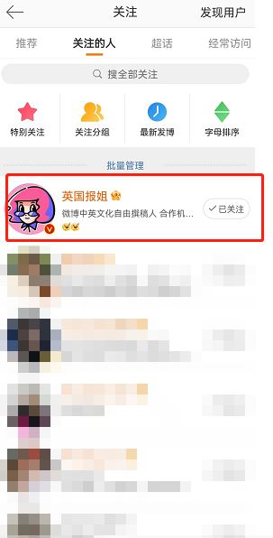 2、在关注列表中找到你想查看的博主点击进入主页。