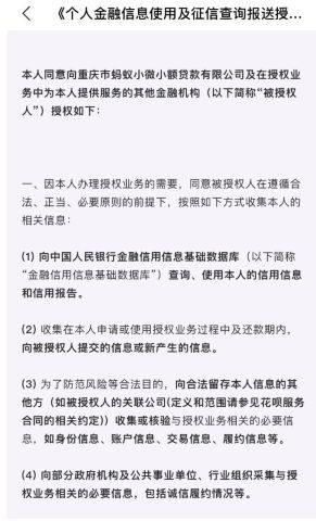 从《个人 金融 信息使用及征信查询报送授权书》来看,花呗服务的提供方为重庆市蚂蚁小微小额贷款有限公司,这也就是花呗上征信的机构。对此业内人士也表示,在不逾期的情况下,对于白户来说,上征信并不是坏事,也会留下良好的还款记录。但对于频繁使用网贷、借款的人来说并不是什么好事。