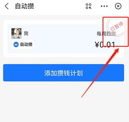 6、当计划中出现已暂停字样即为关闭成功。后续就不会再从银行卡及余额转入到小荷包了。