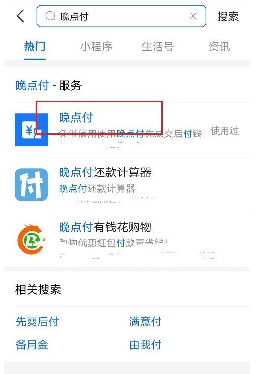 2、第二步点击搜索图标之后,搜索晚点付,点击进去