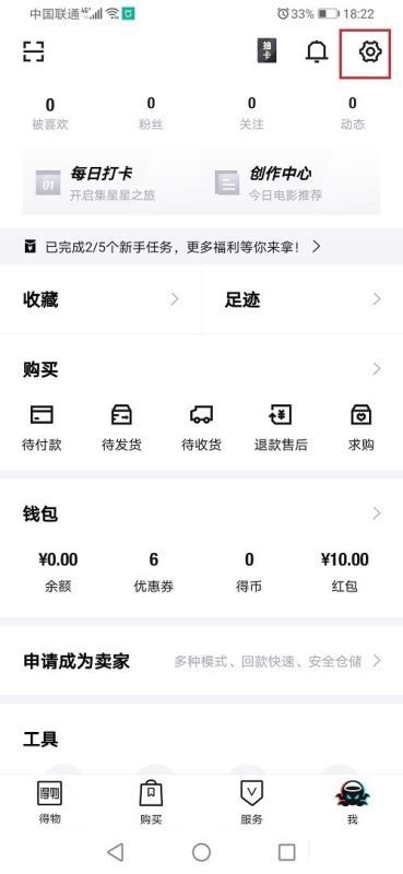 2、进去得物我的界面,点击设置图标,如下图所示: