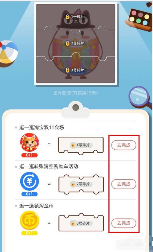4、进入装扮任务界面,装扮分为三个碎片,完成对应的任务;