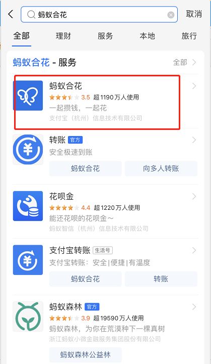 1.进入支付宝首页, 搜索 “蚂蚁合花”