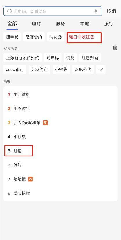 1.进入支付宝首页,在上方 搜索 框内输入“口令红包”