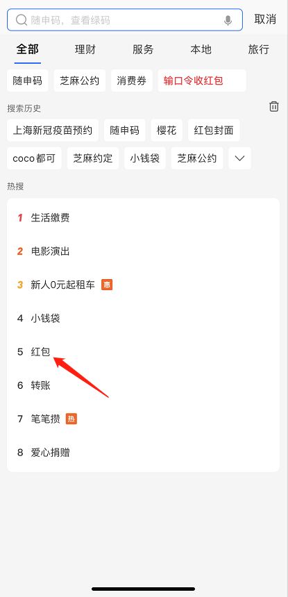 1.进入支付宝首页, 搜索 “红包”进入界面