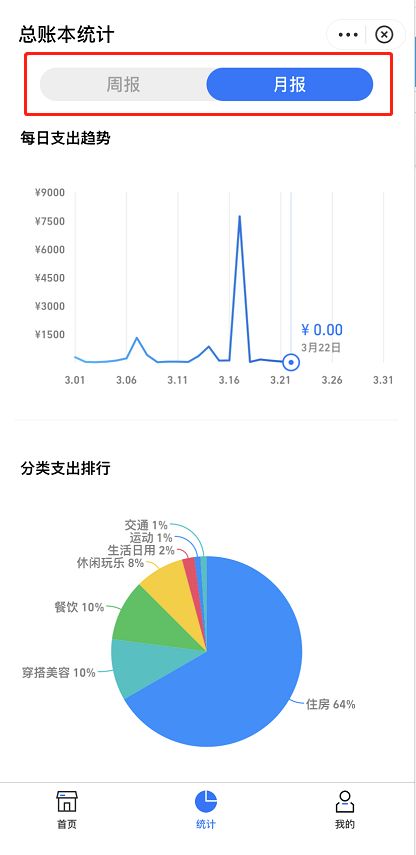 4.在统计界面就可以选择周报和月报功能了