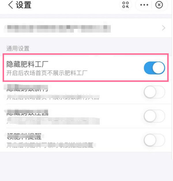 2、在通用设置版块中,将隐藏肥料工厂右侧的按钮开启就可以了。