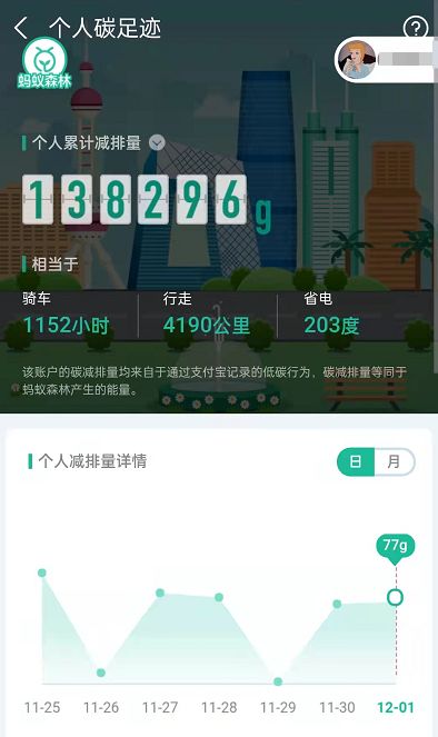 3、在这里就可以查看自己的碳足迹啦。每天和每月减排量详情您可以自由切换查看。