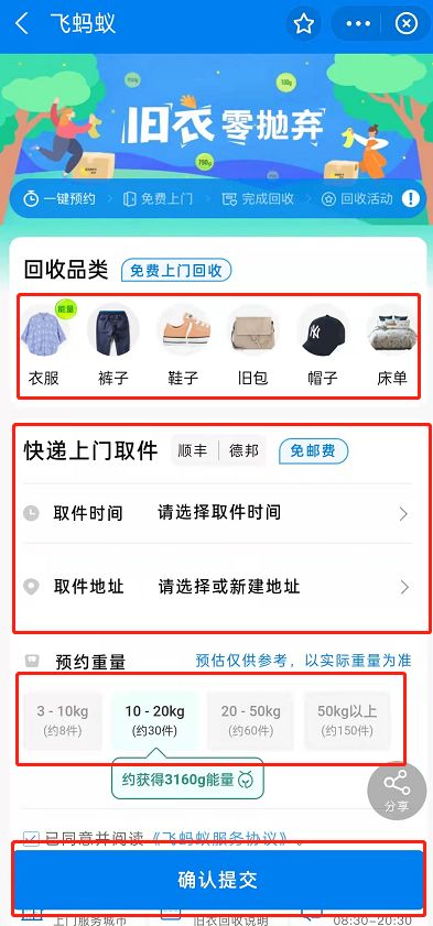 3、填写衣物类型、上门时间、地址信息、预计重量,点击确认提交,等待上门即可。