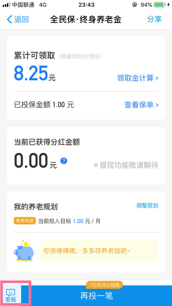 2、从保单中选择养老金保单,找到左下角客服选项。