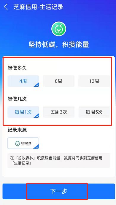 6、您可以根据自身情况选择坚持时长和次数。完成后点击下一步。