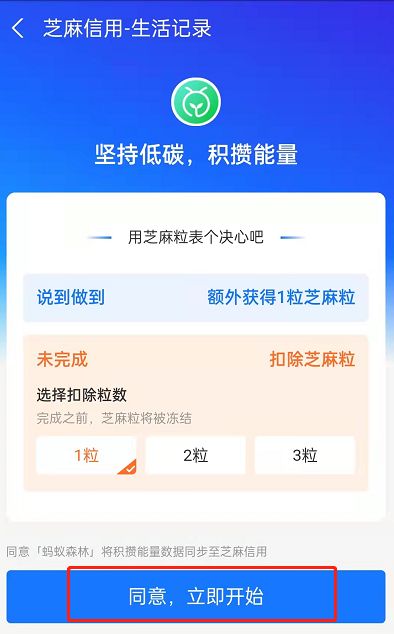 7、可以设置没有完成任务时被扣除的芝麻粒数,点击同意,立即开始即可。