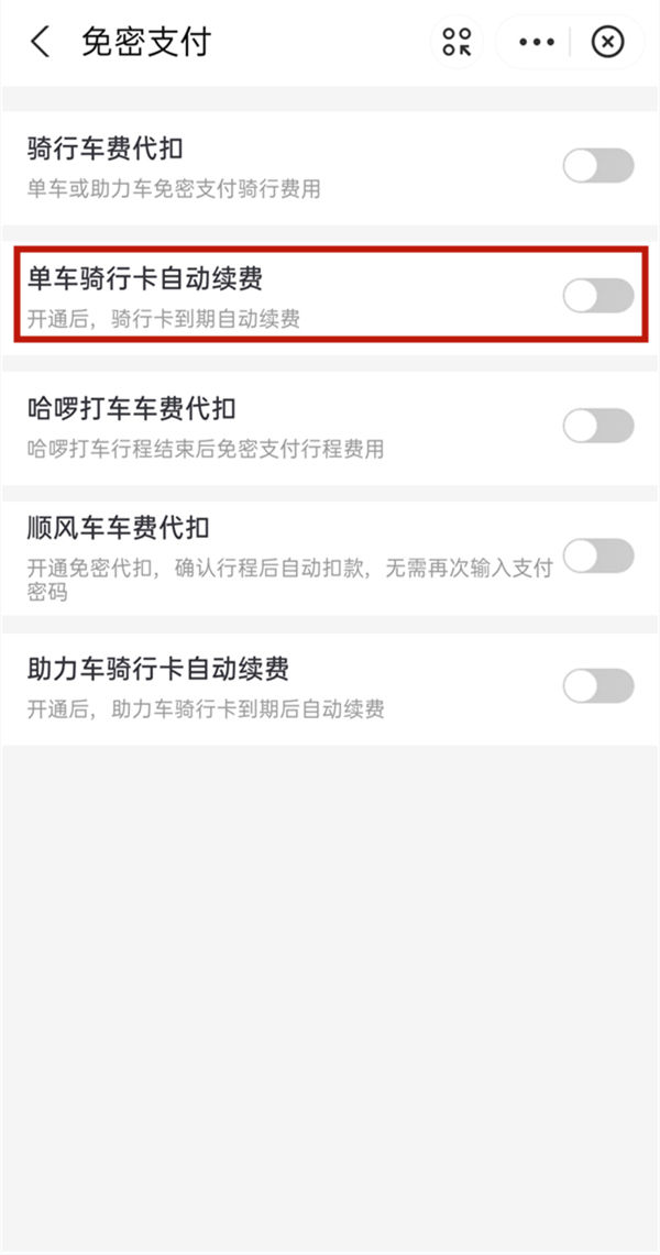3、在免密支付中,将单车骑行卡自动续费右侧的按钮关闭就可以了。