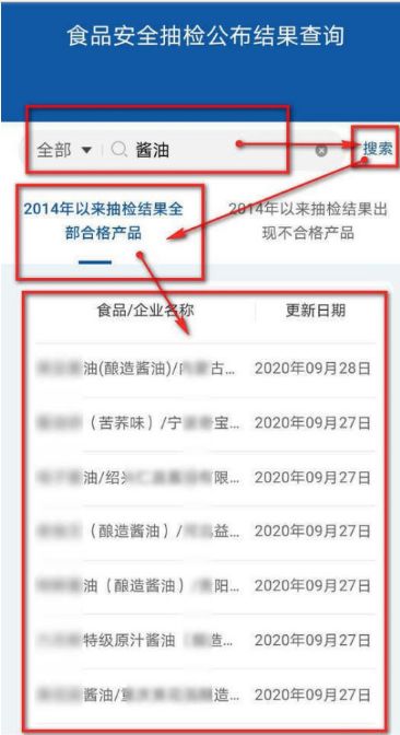 7、搜索框输入所需查询的食品,点击“搜索”,再点击“2014年以来抽检结果全部合格产品”即可查询到所有相关合格产品信息。