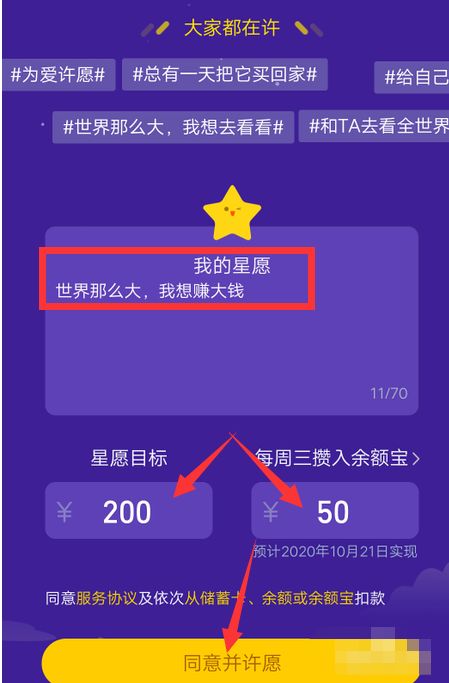 6、最后设置星愿目标金额,点击同意并许愿即可。