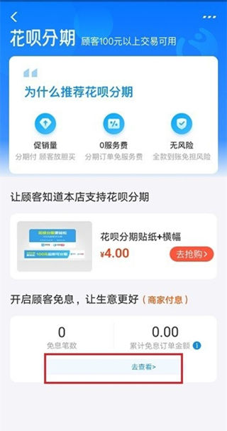 4、进去花呗分期收款界面,点击下方的去查看