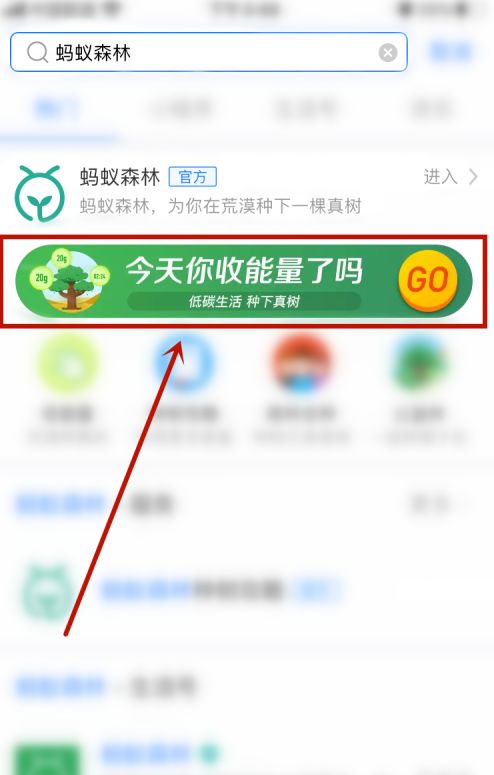 2、顶部 搜索 框输入“蚂蚁森林”,选择小程序,如下图: