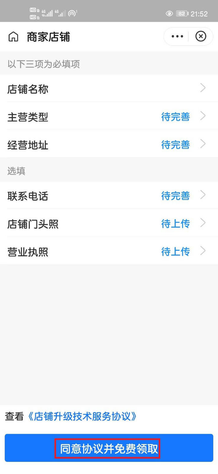 6、点击后,来到商家店铺信息填写界面,填写完后点击下方 领取 即可,如下图所示: