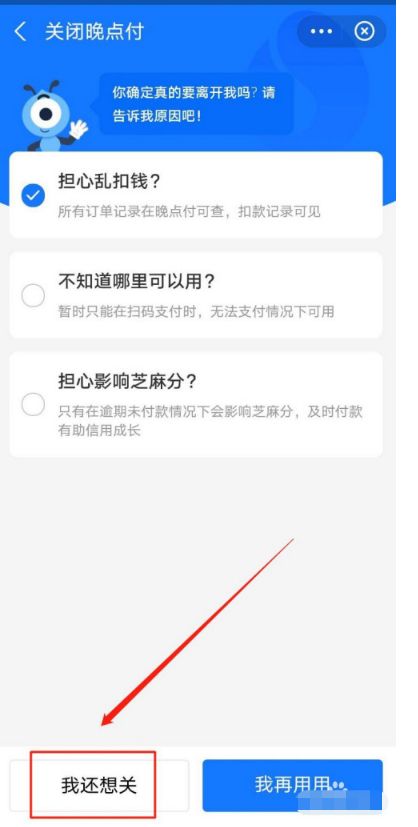 5、然后勾选关闭原因,如:担心乱扣钱?。选择“我还想关”。