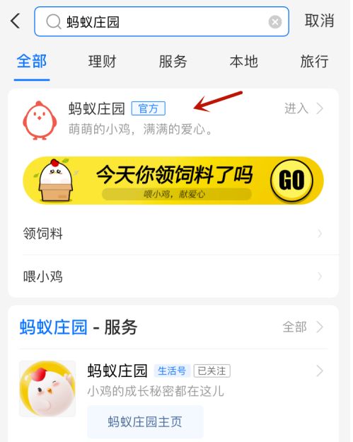 2、搜索【蚂蚁庄园】,点击小程序。
