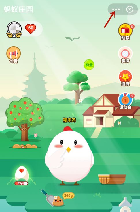 3、进入蚂蚁庄园,点击右上角【...】。