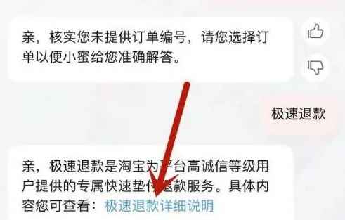 从淘宝官方客服界面, 咨询 问题“淘宝极速退款条件”后点击极速退款。
