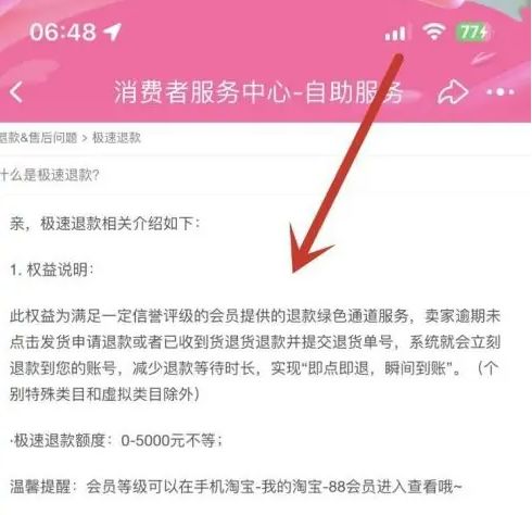 界面就会详细展示出关于淘宝极速退款的一系列条件了。
