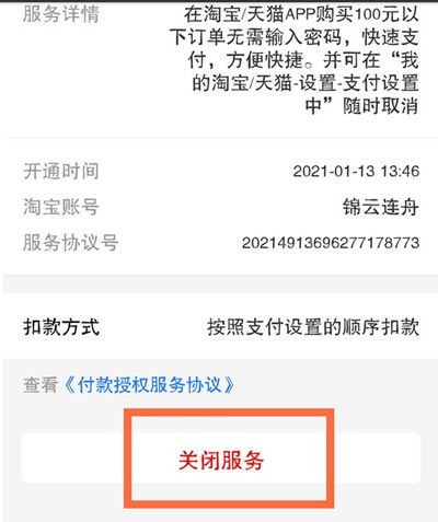在小额免密支付功能的页面中,用户可以通过关闭 服务 选项,即可关闭小额免密支付功能。