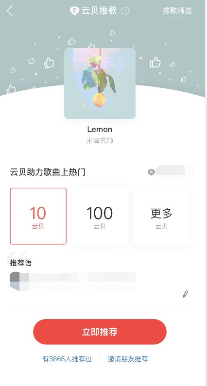 4、你可以更改云贝数量,写上一句推荐语,点击 立即推荐 就能实现云贝推歌了