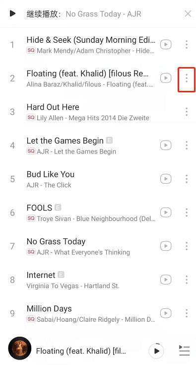 2、找到自己想要听的歌曲,点击歌曲右侧三个点。