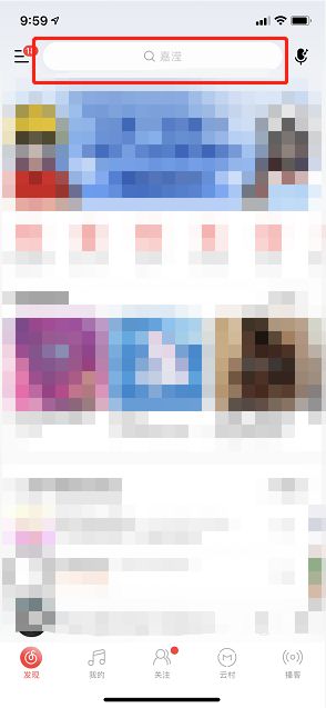 1、开启网易云音乐app,在首页中点击上方的 搜索 版块。