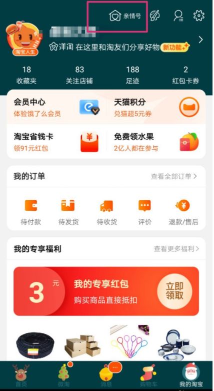 2、点击我的淘宝,如下图,看到亲情号