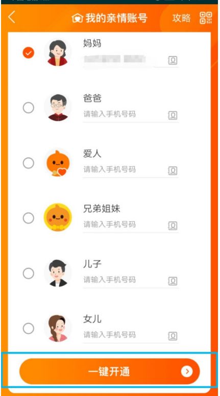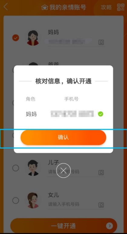 4、点击邀请家人,如下图,勾选妈妈,输入妈妈手机号,点击一键开通