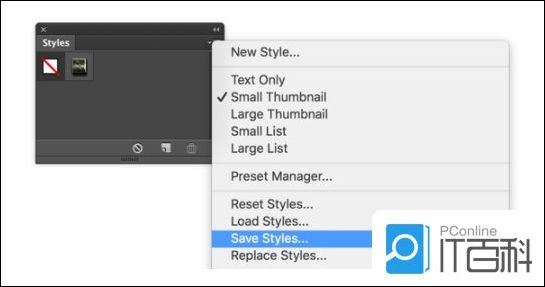 第2步、 您仍然需要将其保存到库中,因此,继续并单击小的下拉图标,然后单击保存样式。尽管建议将其保存在 Photoshop 文件夹中,也可以将其保存在所需的任何位置: