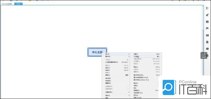 4,确定好中心主题以后,再来了解一下分支主题的创建。第一种方法,我们可以直接点击【右键】,然后进行主题或者子主题的创建;第二种方法,可以在【插入】选项卡中进行插入;第三种方法,可以使用快捷键来进行创建,点击【回车】键,就可以完成分支主题的创建。如下图所示: