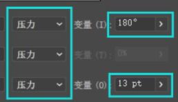 在“书法画笔”属性设置窗口中,选择角度、圆度、大小的模式为【压力】,将变量值调整到最大值。