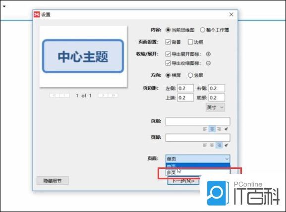 3、然后在设置弹窗里面的页面点击下拉选择多页,选择之后点击下一步