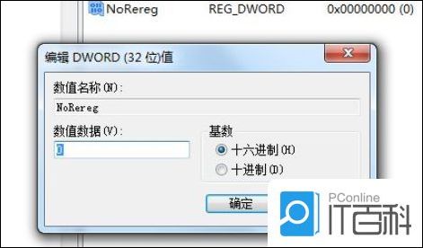 8、再鼠标右键NoRereg,在弹出的编辑 DWORD (32位值将数值数据改为0,点击确定就可以了