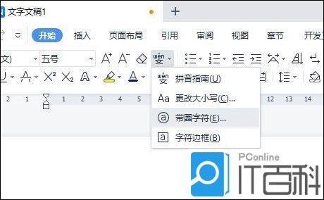 接着我们选中要转换的数字,点击上方的【拼音指南】旁边的箭头,选择【带圈字符】。