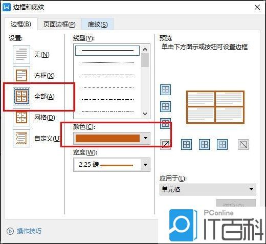接着在弹出框中选择“边框”然后选择要设置颜色的边框。点击“颜色”,选择需要的颜色,选择应用的边框,点击“确定”即可。
