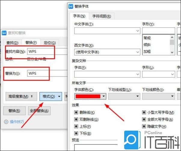 在查找处输入“WPS”,在替换为输入“WPS”,并点击“格式”--->“字体”--->“字体颜色”--->“红色”。
