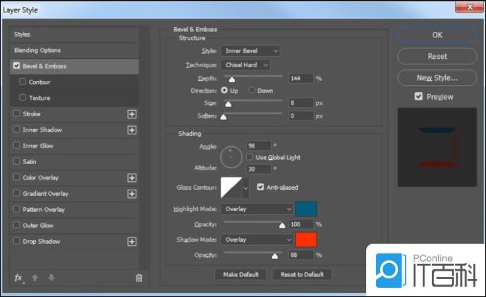 第2步、 使用以下设置将 “斜面”和“浮雕”添加到涂鸦字母 3D 文字效果: