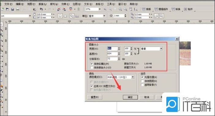4、此时将转换为位图的图像大小以及分辨率设置一下点击确定,那么一个psd文件就完成了