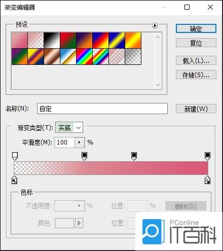 4、你可以在预设处选择你渐变颜色的方式,在底下的渐变颜色处可以拉动上下的色标进行设置颜色的长度,也可以自己加几个色标进去改变颜色